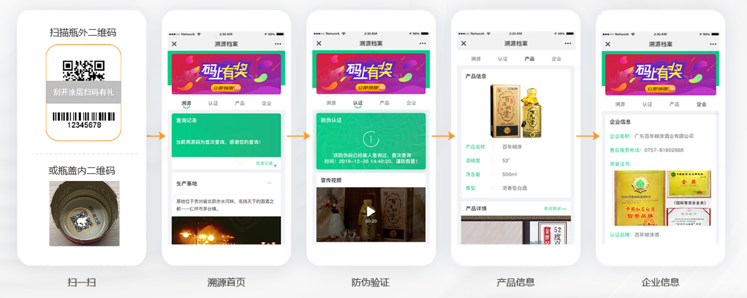 扫码后会显示产品溯源信息,展示产品制造工艺,优势特点等;还能验证产品真伪,通过活动入口, 可进入营销流程。