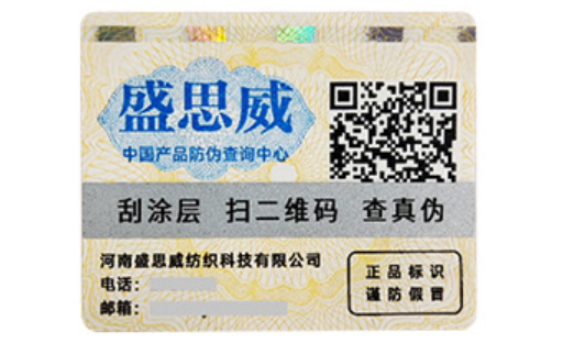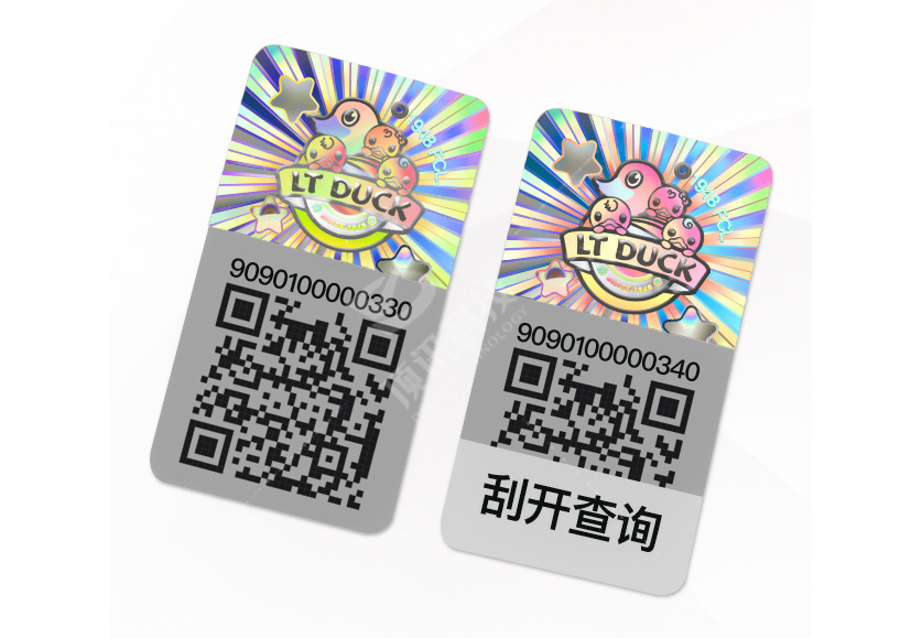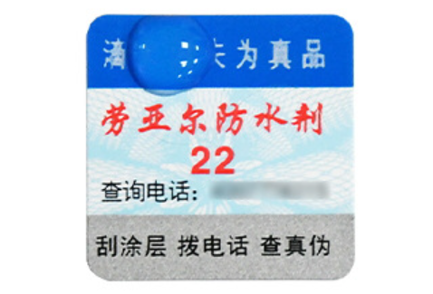 技术:运用可印刷纸为面料、覆上粘合剂及粘合在离心底纸上,经过表面印刷、植入防伪技术、喷防伪码、刮图层、覆膜、切刀口、模切等工序后制作而成。