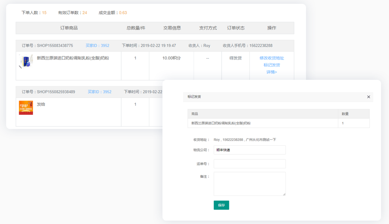 支持修改发货地址、标注物流公司、填写运单号、查看详情等操作。