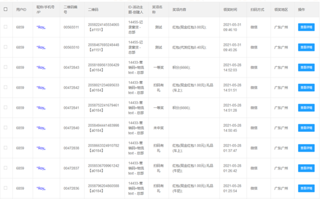 在营销后台可以查看实时领奖明细,掌握奖品去向。