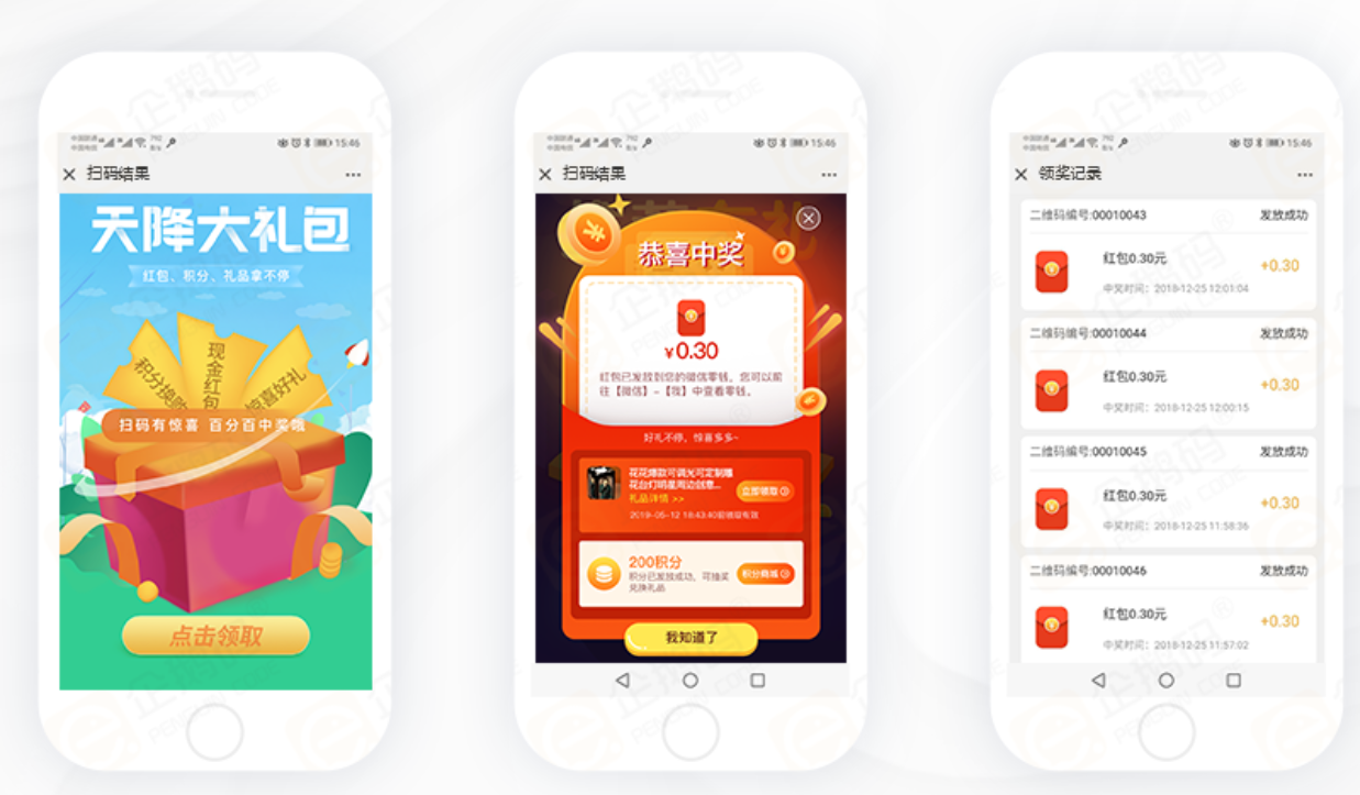见的营销互动类型有扫码发红包、扫码大转盘、扫码领取实物奖品、扫码领取积分等。